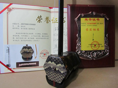 二胡制作大師丁家彭先生1949年出生樂器世家,17歲隨其祖父學琴藝,并深得精髓,其聰穎好學,悉心鉆研與 探求二胡制作,博得同行的欽佩贊許,更得了許多知名演奏家的稱贊,充分認識到二胡制作每個環節,都對二胡制作都有影響力,因此對二胡的選材,選料,蟒皮都十分嚴格,二胡整體穩定性良好,環境干擾影響極小。